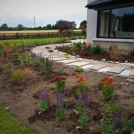 Orange and purple is the colour scheme for this naturalistic gravel garden to walk through and enjoy movement and textures.